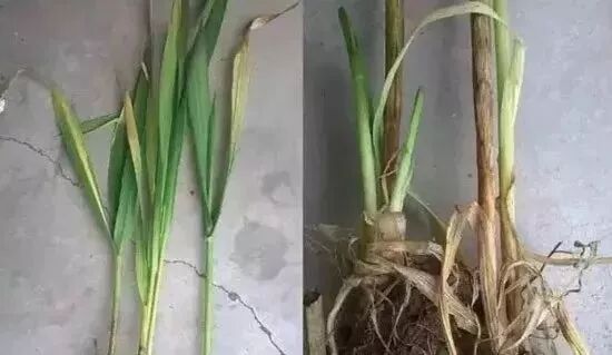发病初期,第一叶鞘上出现灰褐色云纹病斑,后因抽不出新叶致使病苗枯死。